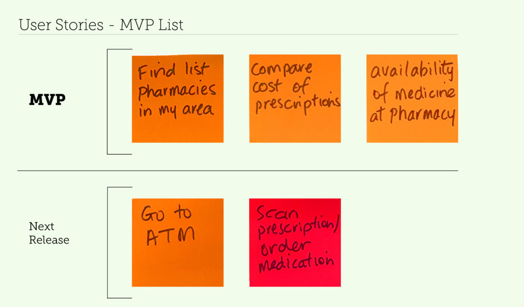 I grouped the set of User Stories by similar story themes onto a User Story Map which flowed from left to right in order to indicate priority/importance. I selected the minimum collection of user stories (MVP) that could be built and implemented in a short amount of time and yet still deliver a product of real value to people. Solution Idea 1, building the App was chosen for the MVP and following a review of the user stories, the ‘ATM’ functionality was chosen for the next release.