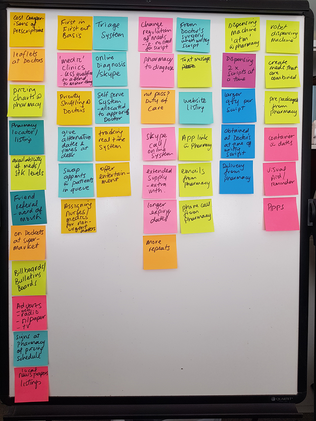 The HMW Problem Statements became the focus of my ideation effort. Armed with a marker pen and a series of colourful Post-It notes it was time to brainstorm ideas. I allowed 15 minutes per HMW Problem Statement to quickly write ideas onto Post-It notes. Placing the ideas under each of the six HMW Problem Statements on the wall enable me step back and visualise a number of possible solution ideas.
